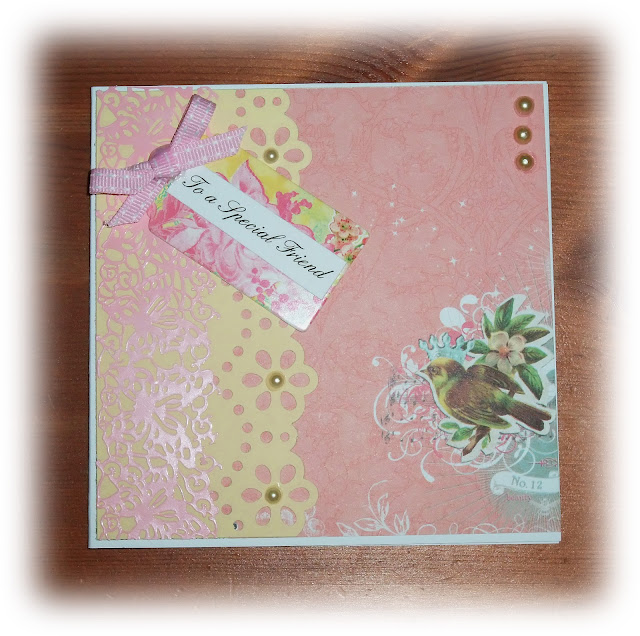 A while ago, after seeing an idea in a magazine somewhere I asked my 'handy' brother if he would be able to cut some blank door hangers for me. After some debate as to what material to use we decided to try first with some thin MDF. He cut me a few blanks, most of which have been sitting in my craft room ever since, waiting for me to find the time to do something with them! However, a couple of months ago I decided to play around with one of them and here is the result.......